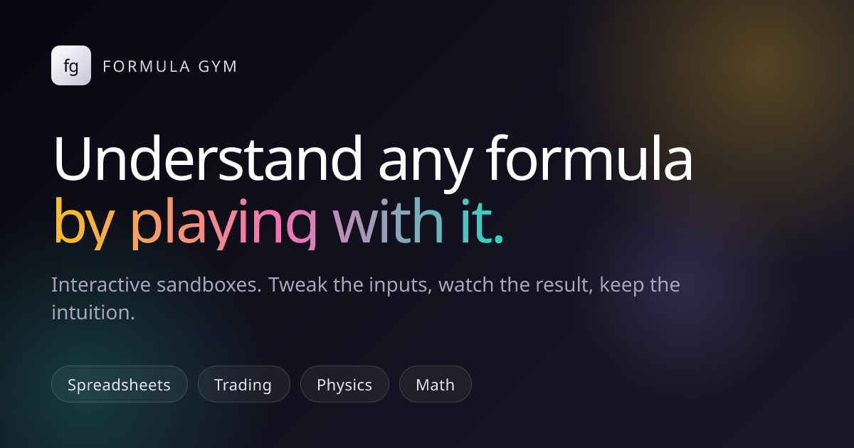 Formula Gym turns each formula into a hands-on sandbox. Instead of memorising syntax, you change the arguments and watch the result resolve in real time — so when you hit a real problem, you reach for the right formula because you already know what each piece does. Today the catalogue covers spreadsheet functions (VLOOKUP, SUMIF, and more on the way). Math identities, physics equations, and trading indicators will follow on their own subdomains as the library grows.